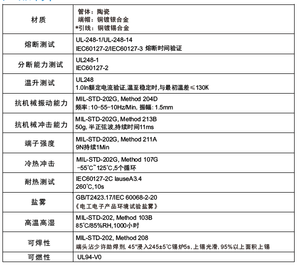 預(yù)期飛弧/熔斷時間,電流特性:當保險絲通以下述規(guī)定電流時,熔斷時間必須符合表格要求,熔斷后管體不應(yīng)破裂,端蓋不應(yīng)脫落。
