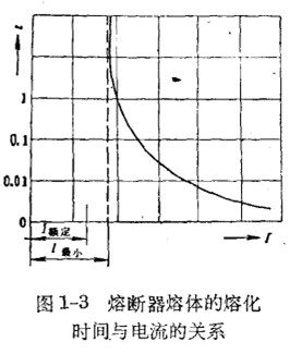 熔斷器的熔體從固態(tài)轉(zhuǎn)到液態(tài)直至汽化的過(guò)程通常叫做熔化過(guò)程,熔化過(guò)程的時(shí)間與電流的大小有關(guān)。電流愈大,熔化時(shí)間愈短。圖1-3所示為熔斷器熔體的熔化時(shí)間和電流的關(guān)系曲線。當(dāng)電流逐漸減小到某一數(shù)值時(shí),熔化時(shí)間就趨近于無(wú)窮大,達(dá)到這一數(shù)值的電流我們稱做最小熔化電流I最小。