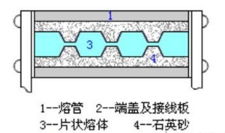 另外一種如下圖所示。熔體裝在有絕緣砂粒填料(如石英砂)的熔管內(nèi),在熔體斷開電路產(chǎn)生電弧時(shí),絕緣砂??晌针娀∧芰浚饘僬魵饽苌l(fā)到砂粒的縫隙中,熔體很快冷卻,從而達(dá)到滅弧的目的。